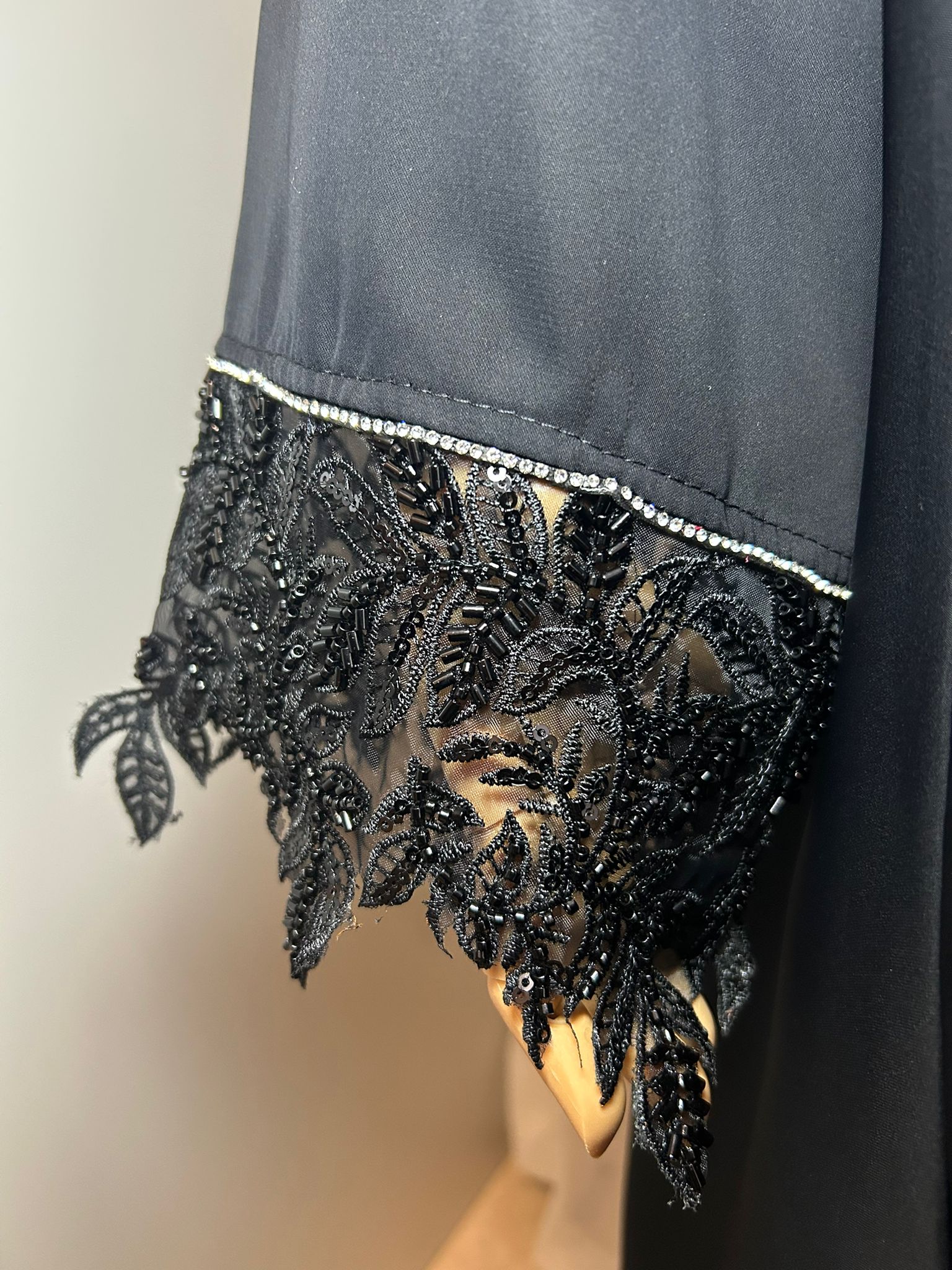 Besondere Akzente setzen die zarten Spitzen- und Stickereidetails an den Ärmeln sowie das fein gearbeitete Element im oberen Bereich, das dem Design Tiefe und Raffinesse verleiht, ohne aufdringlich zu wirken. Die Ärmel enden in einer edlen Spitze mit dezenten Glanzdetails, die bei Bewegung subtil schimmern.