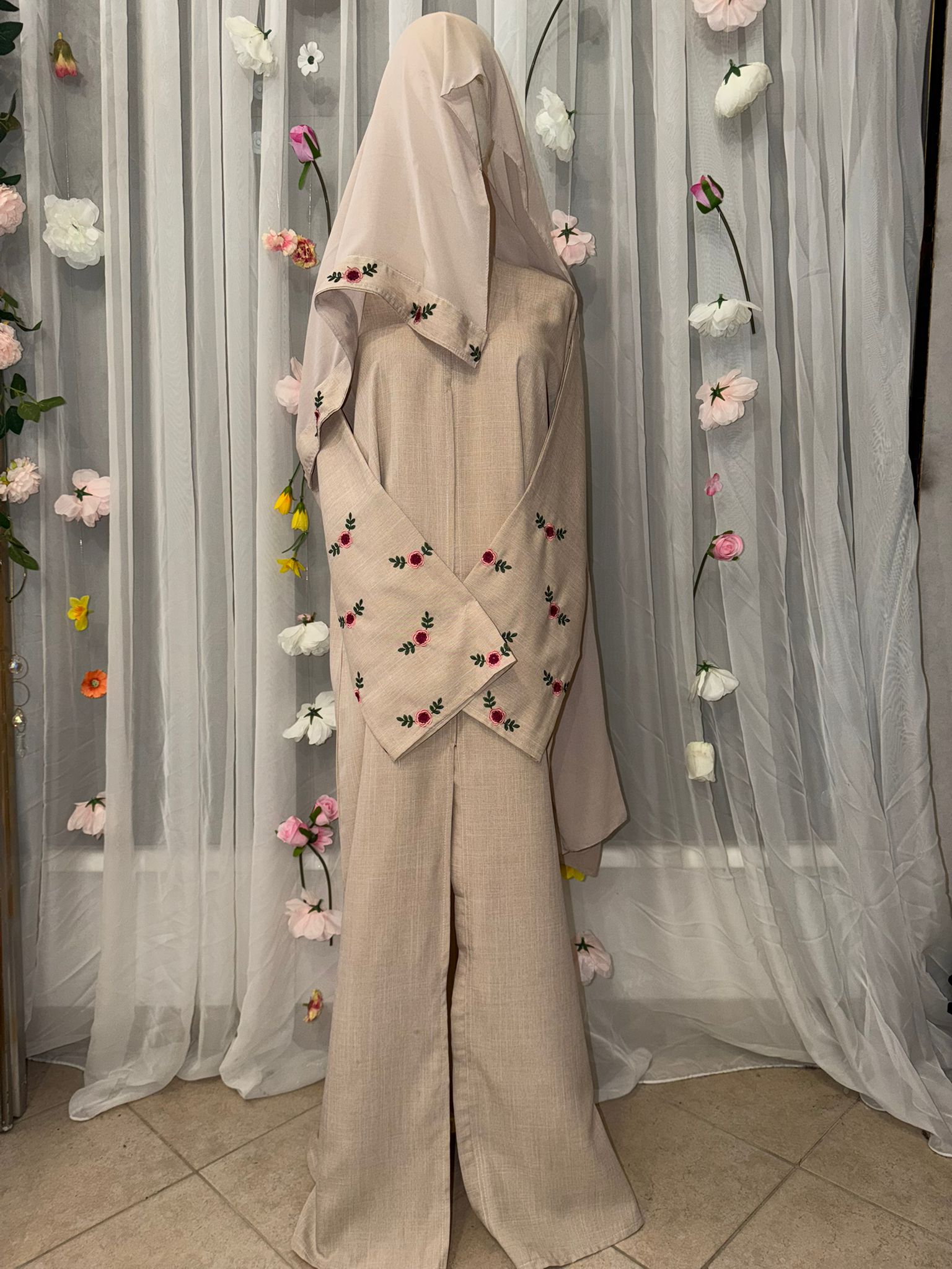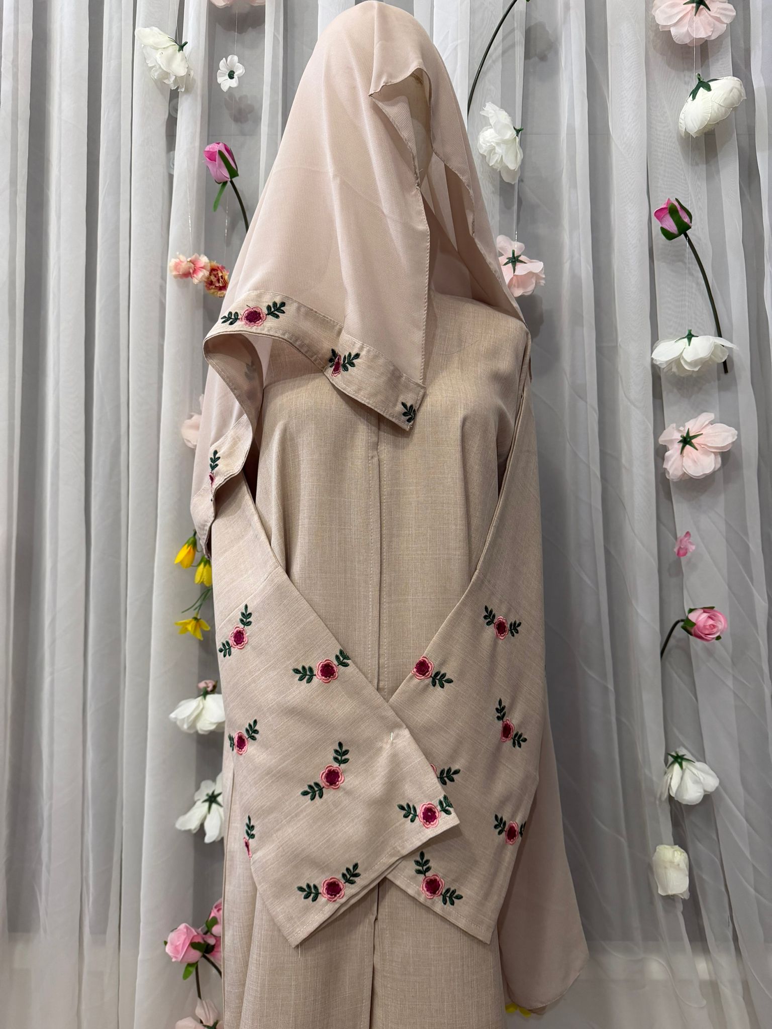 Wunderschöne Abaya aus unserer UAE Kollektion.Mit edler bestickung an den Ärmeln und auch Hijab.Wunderschöner, pflegeleichter Stoff - Leinen-Polyestermix. UAE Größenempfehlung...