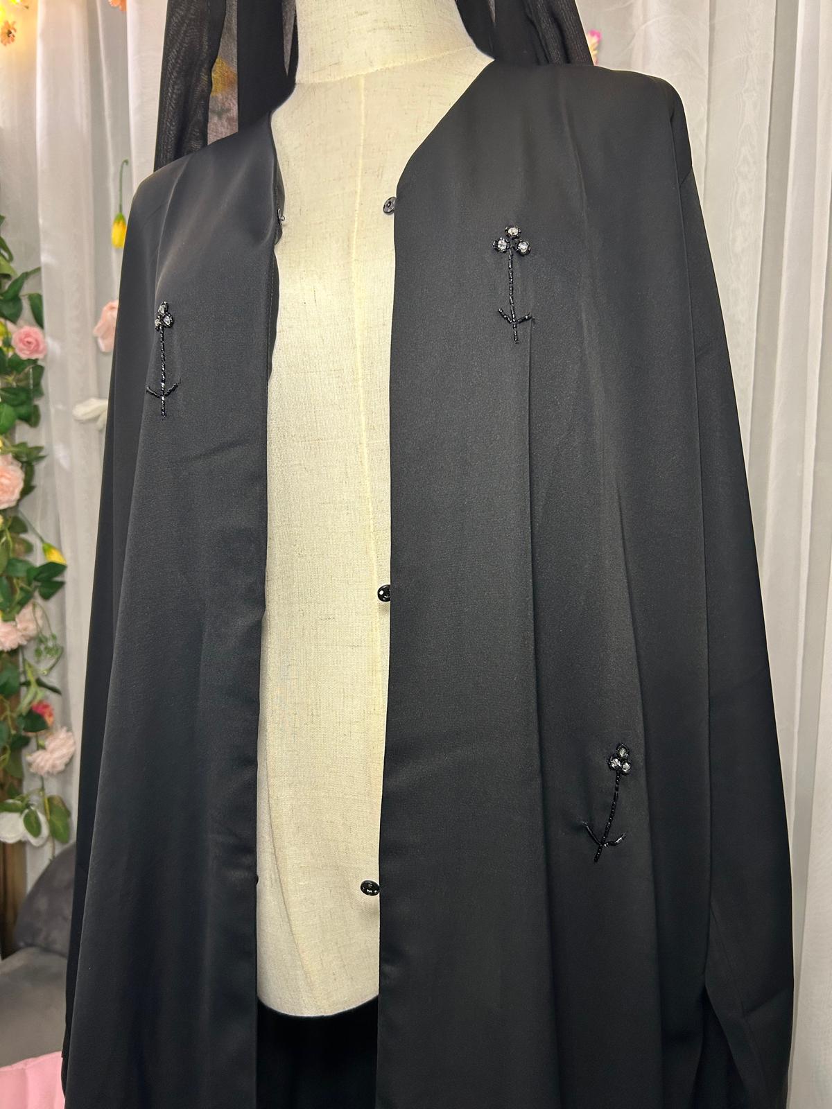 Schlichte, elegante Dubai-Abaya aus hochwertigem Nidha-Stoff. Die feinen Handperlen-Blüten verleihen ihr dieses luxuriöse „gewisse Etwas“, ohne aufdringlich zu wirken, perfekt...