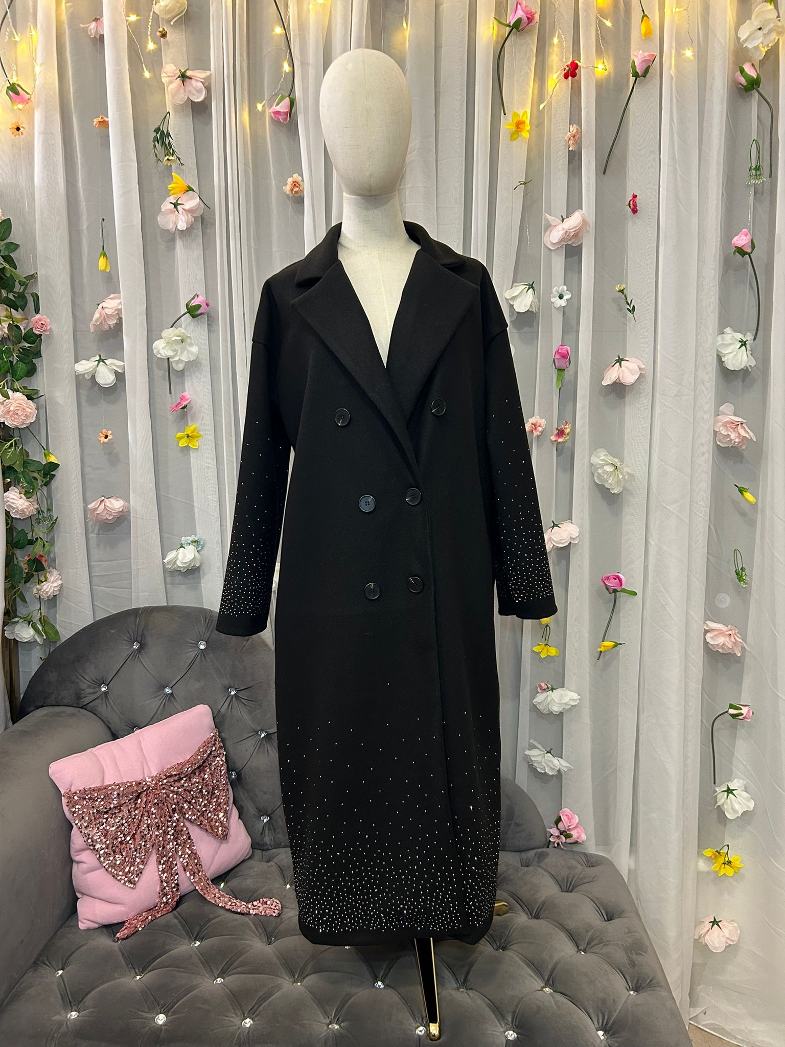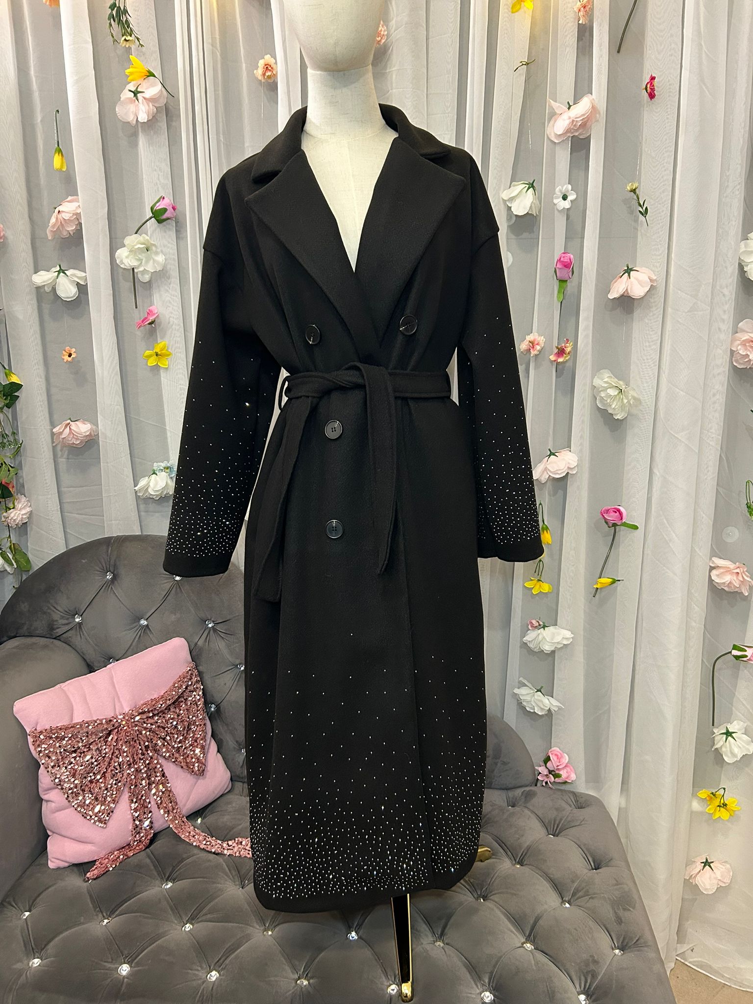 Ein edler, tiefschwarzer Mantel mit funkelnden Glitzersteinchen entlang der Ärmel und des unteren Saums. Die Steine schimmern dezent im Licht...