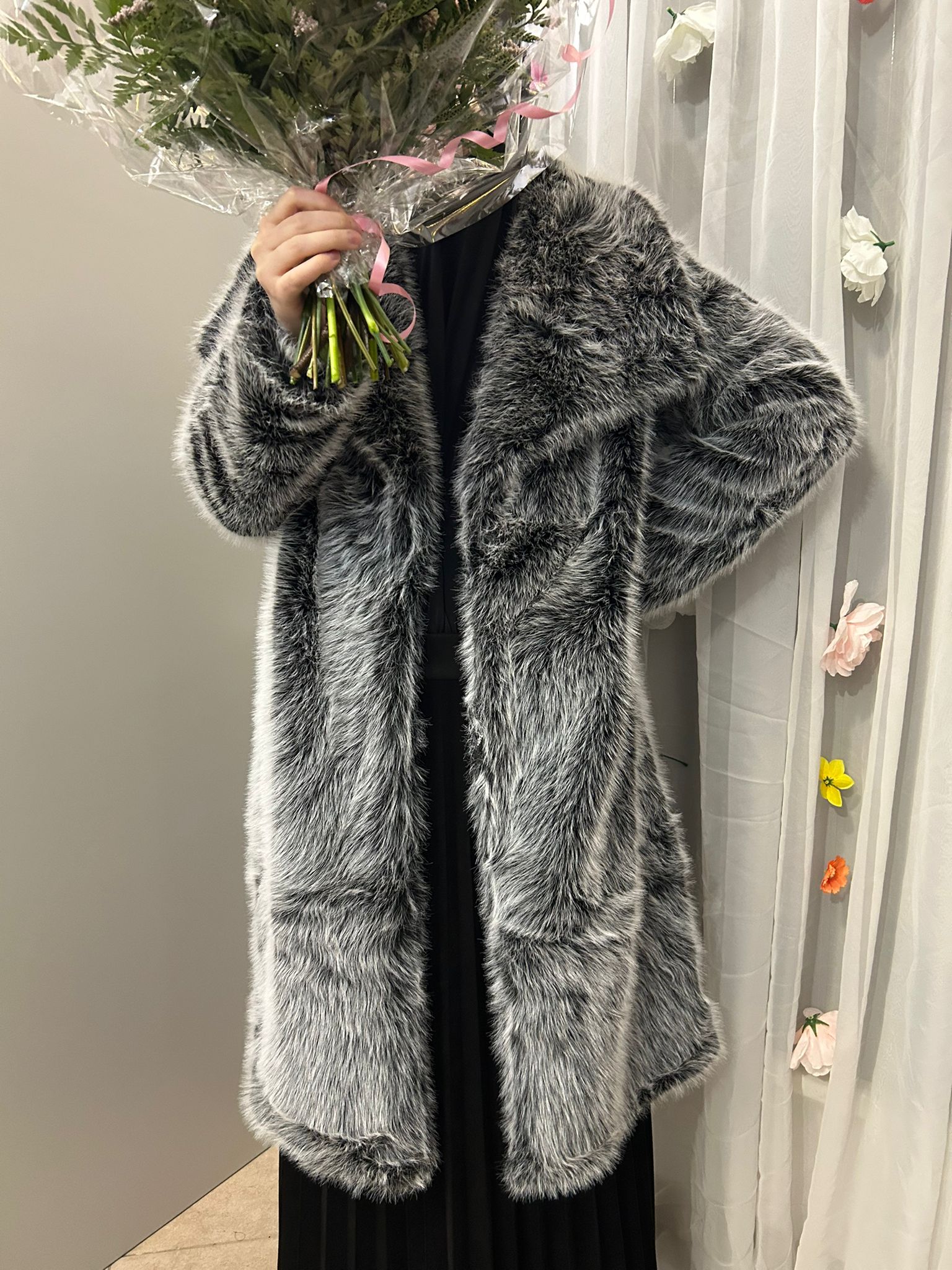 Der Mantel Armina ist ein ausdrucksstarkes Statement-Piece für die kalte Jahreszeit. Die edle graue Felloptik verleiht dem Mantel Tiefe und Charakter, während der lange, gerade Schnitt für eine elegante Silhouette und optimale Bedeckung sorgt.