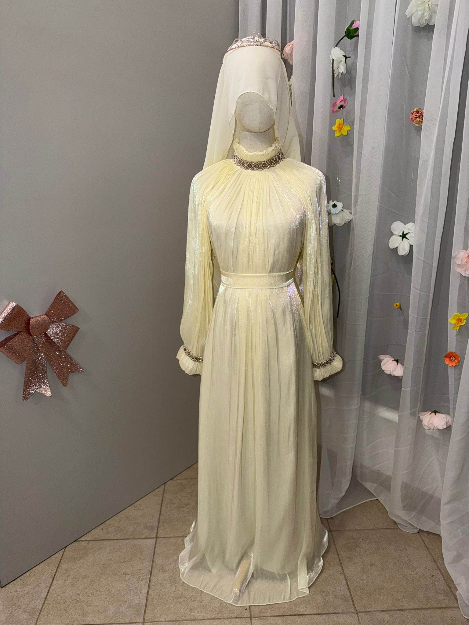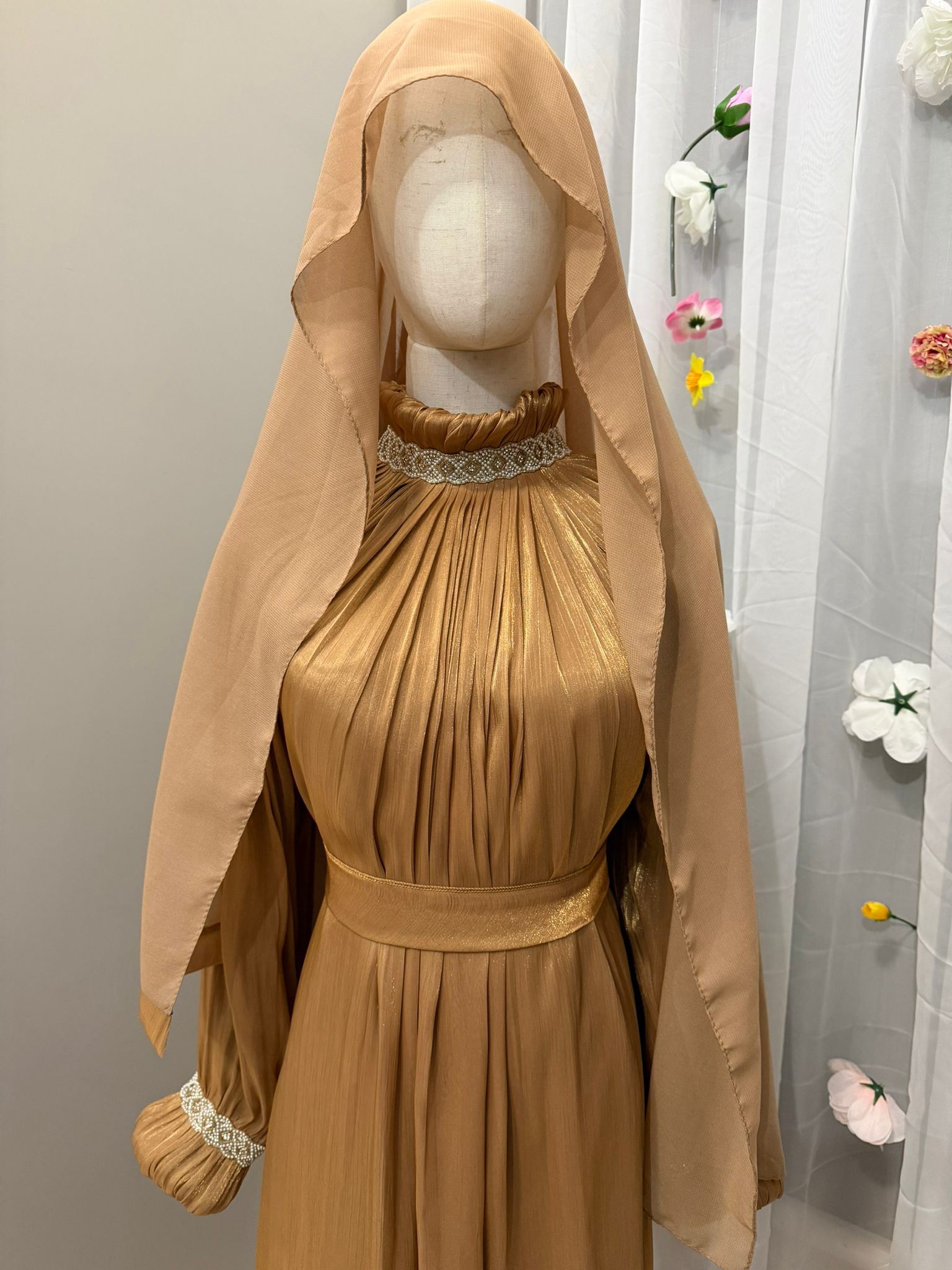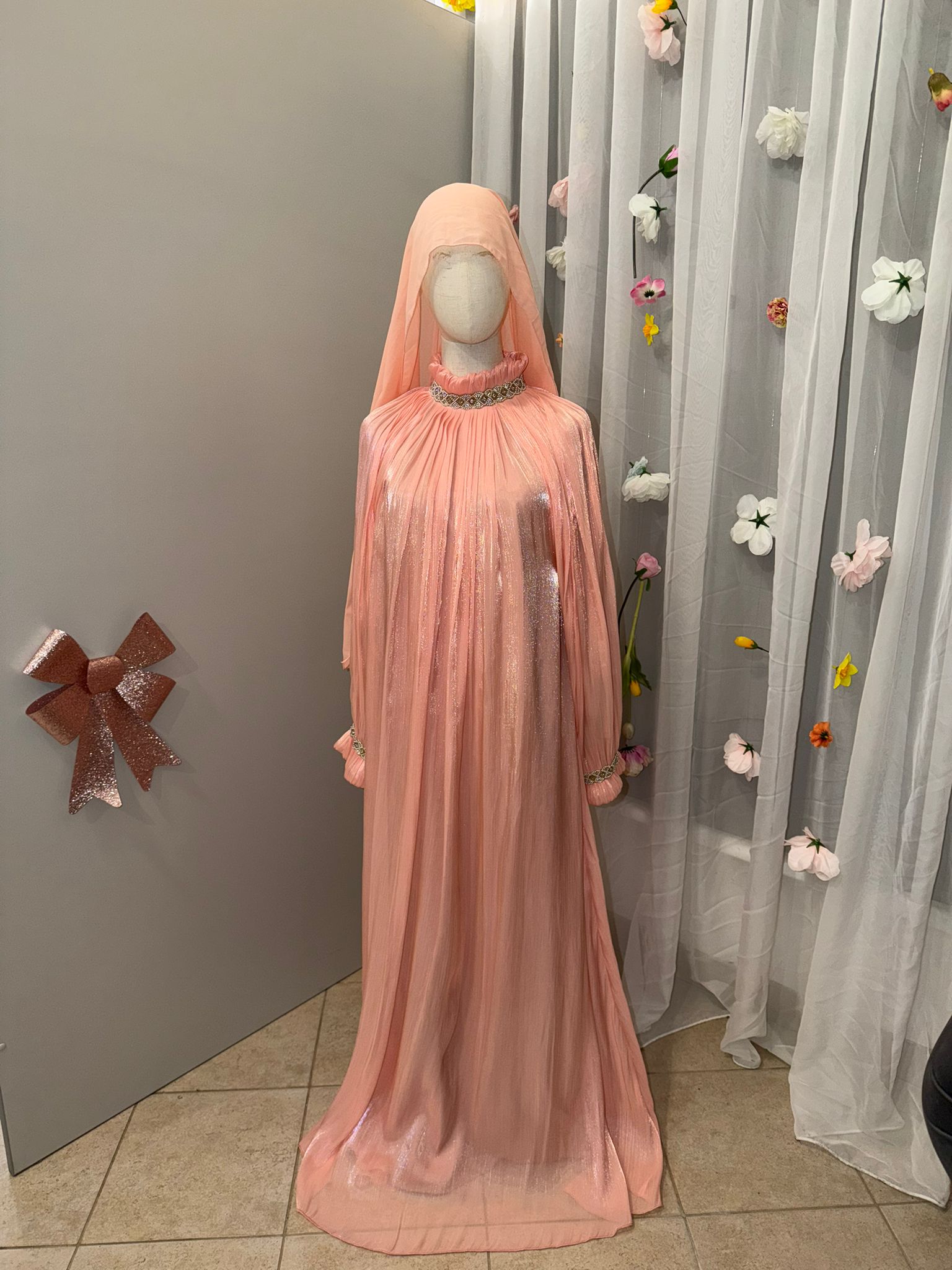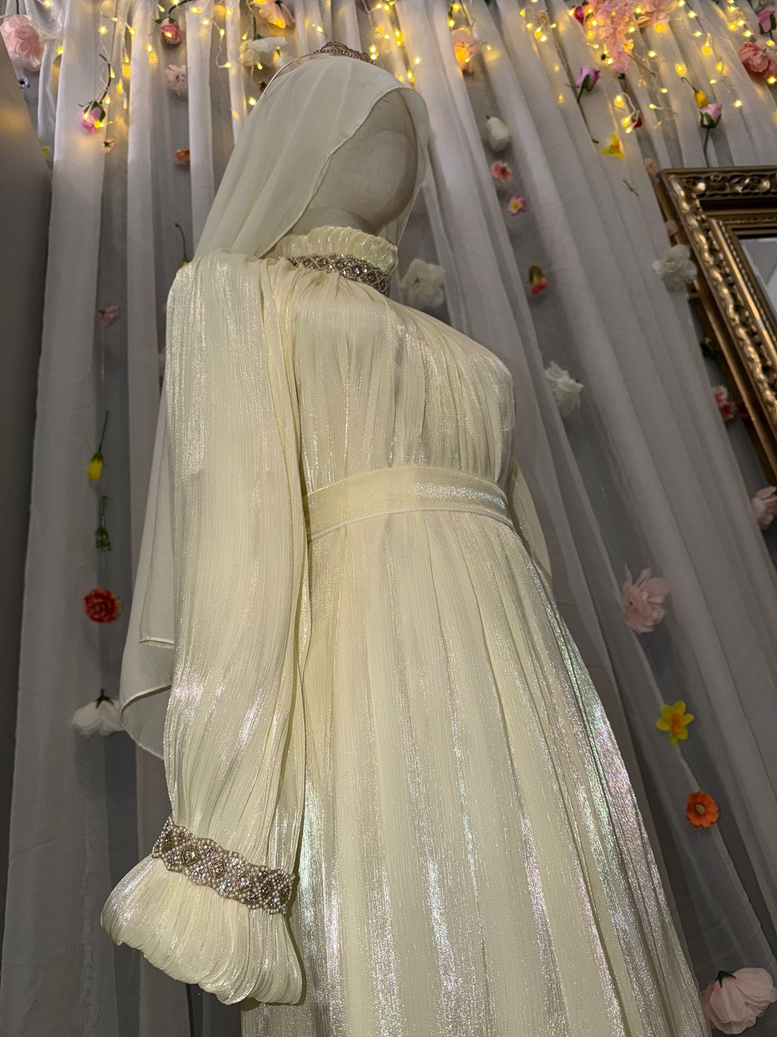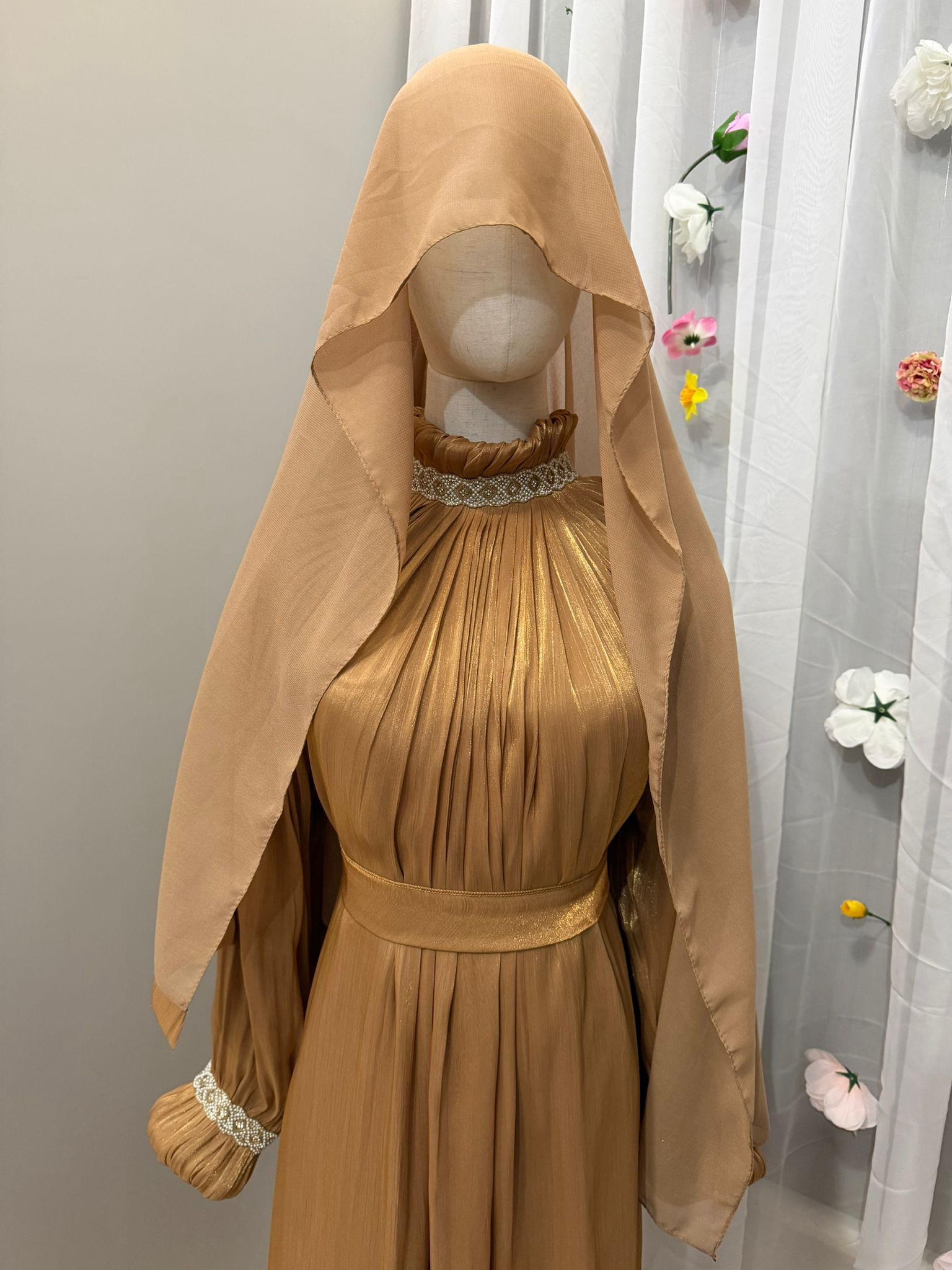Das Set besteht aus einem langarmigen Unterkleid, einem leichten Überwurf, sowie passendem Gürtel und Hijab – harmonisch aufeinander abgestimmt und perfekt für Nikah, Verlobung, Eid und besondere Feste.