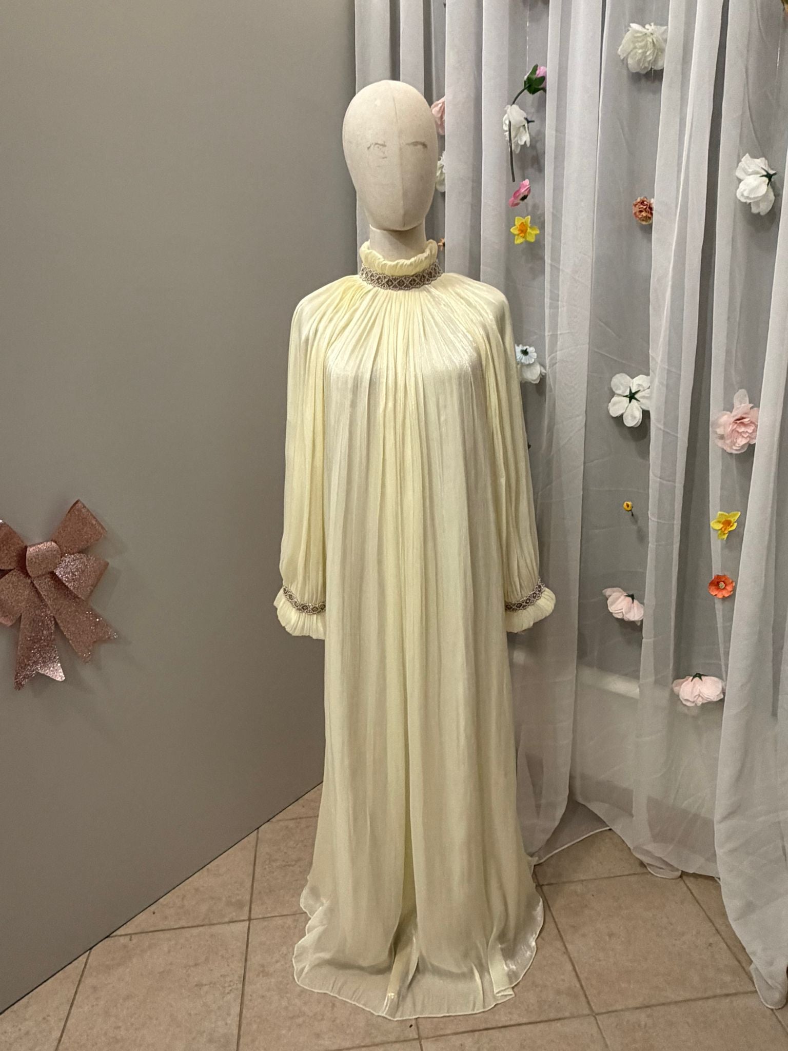 Die Empfehlung basiert auf der Körpergröße. Schnitt, Körperbau und gewünschte Länge (bodenlang oder knöchellang) können die Wahl beeinflussen. Wenn du zwischen zwei Größen liegst oder es bodenlang magst, wähle die längere.