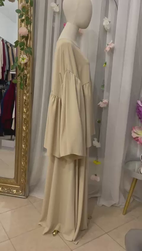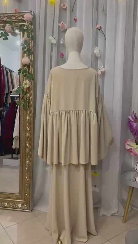 Der Zweiteiler Aleena besteht aus einem weit fallenden Oberteil mit eleganten, ballonartigen Ärmeln und einem langen, fließenden Rock. Gefertigt aus hochwertiger Medina-Seide (Polyester), fühlt sich das Set angenehm weich an, fällt edel und bietet maximalen Tragekomfort.